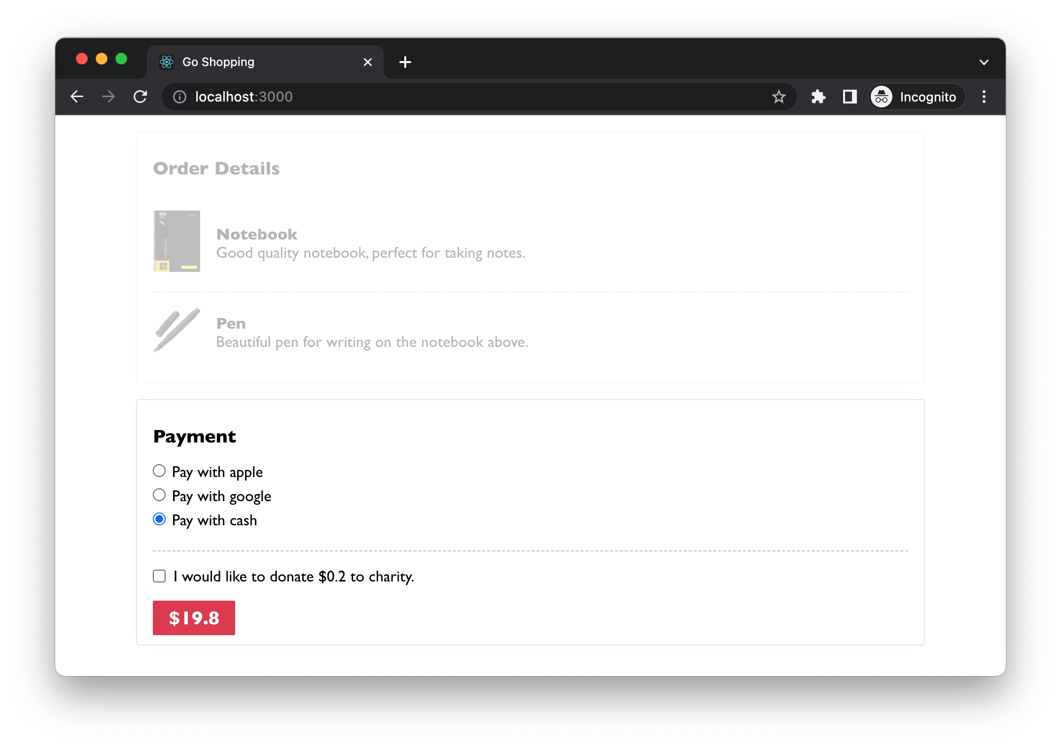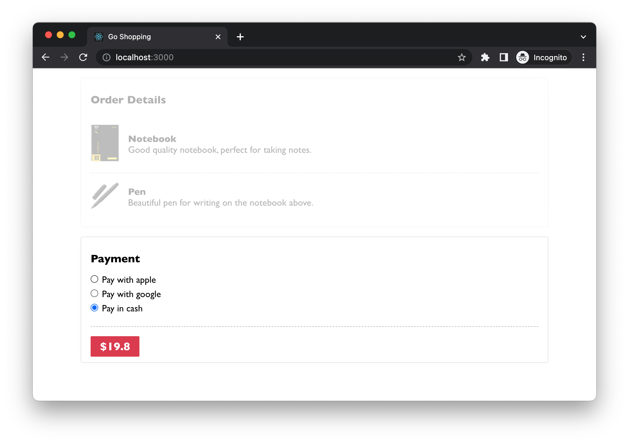 I’m using an oversimplified online ordering application as a starting point. In this application, a customer can pick up some products and add them to the order, and then they will need to select one of the payment methods to continue.