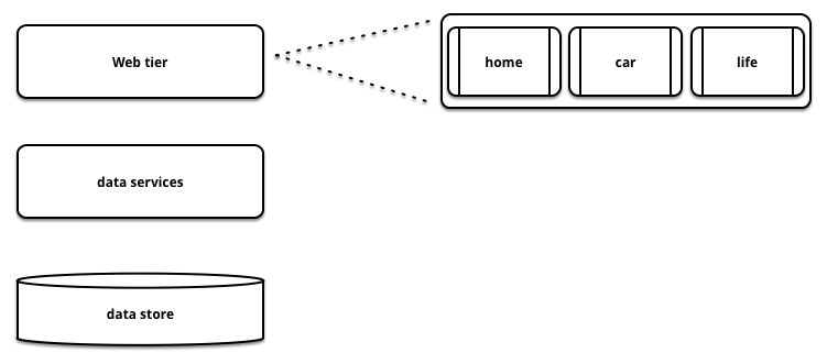 In the insurance domain, different product types have very different characteristics. For example Vehicle insurance is typically high volume but low margin, whereas Home insurance is the opposite. It is also highly competative so the ability to make changes quickly is very important. One insurance company we worked with had developed a 3-tier architecture that served as the quoting engine for all the different products the insurer offered including Vehicle, Life, Home and Pet lines as shown in figure 1.