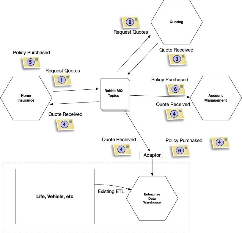 The above figure shows the event-driven architecture that the team started to build out. Communcation with the Quoting Engine and with the Customer Management capabilities was via events passed over a RabbitMQ message bus. These events were also propagated to the existing enterprise data warehouse for reporting purposes.