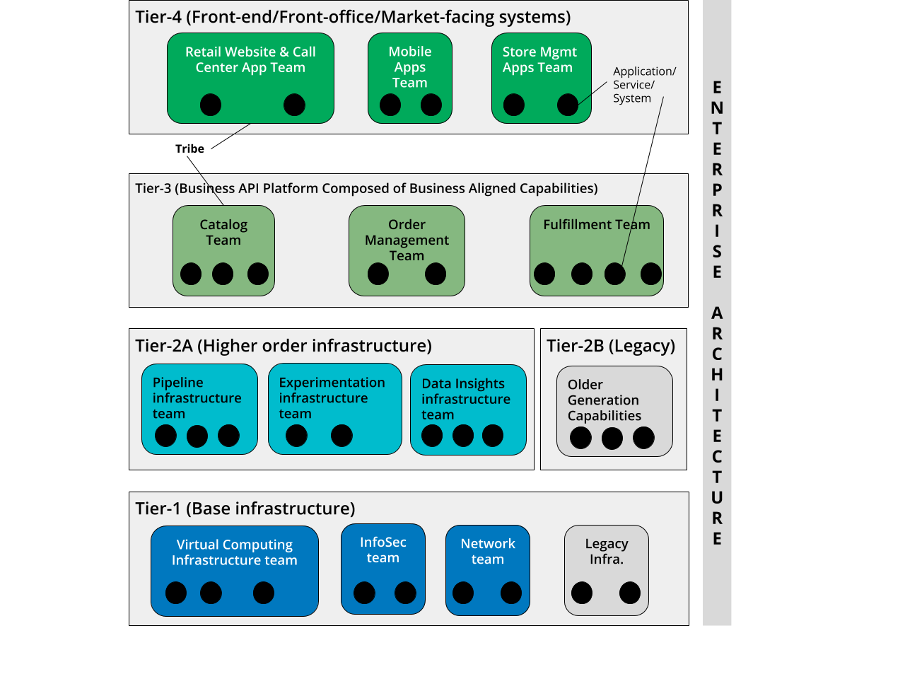The online retail example described earlier suggested product-mode teams such as catalog, order-management, checkout and fulfillment. The retirement products example suggested product-mode teams such as on-board, enrol, save and withdraw. This brings up the question whether these teams have end to end responsibility with respect to the enterprise application stack, i.e. from market-facing front-end systems all the way to back-end systems that support back-office functions (Tiers 3 and 4 in the picture below). The answer is “not always” for reasons below.