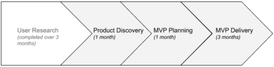 Three leaders from existing product teams within the organization were identified to orchestrate the effort: a design lead, a technical lead and a product manager. Over some months the trio worked on a discovery and built a plan to establish the specifics for the first phase of delivery resulting in a definition of the MVP user journey and a high level story map.