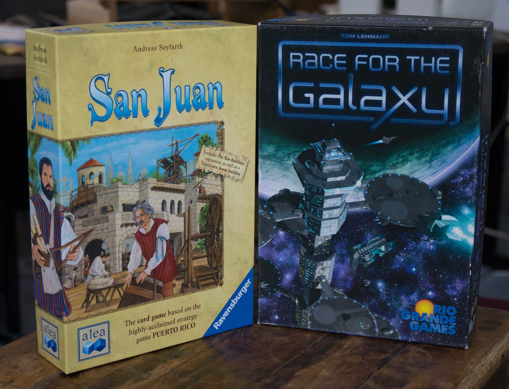 San Juan and Race for the Galaxy (henceforth “Race”) are two card games with a common origin and similar gameplay. I enjoy both games a lot, and they have enough differences in their appeal that I'm happy to own both. The essence of their differences is that Race is the deeper and more complex game, so appeals more to people who are comfortable with more complexity in rules and gameplay. Furthermore Race makes heavy use of icons to explain what its cards do - some find the icons work well once learned, others find them very off-putting.