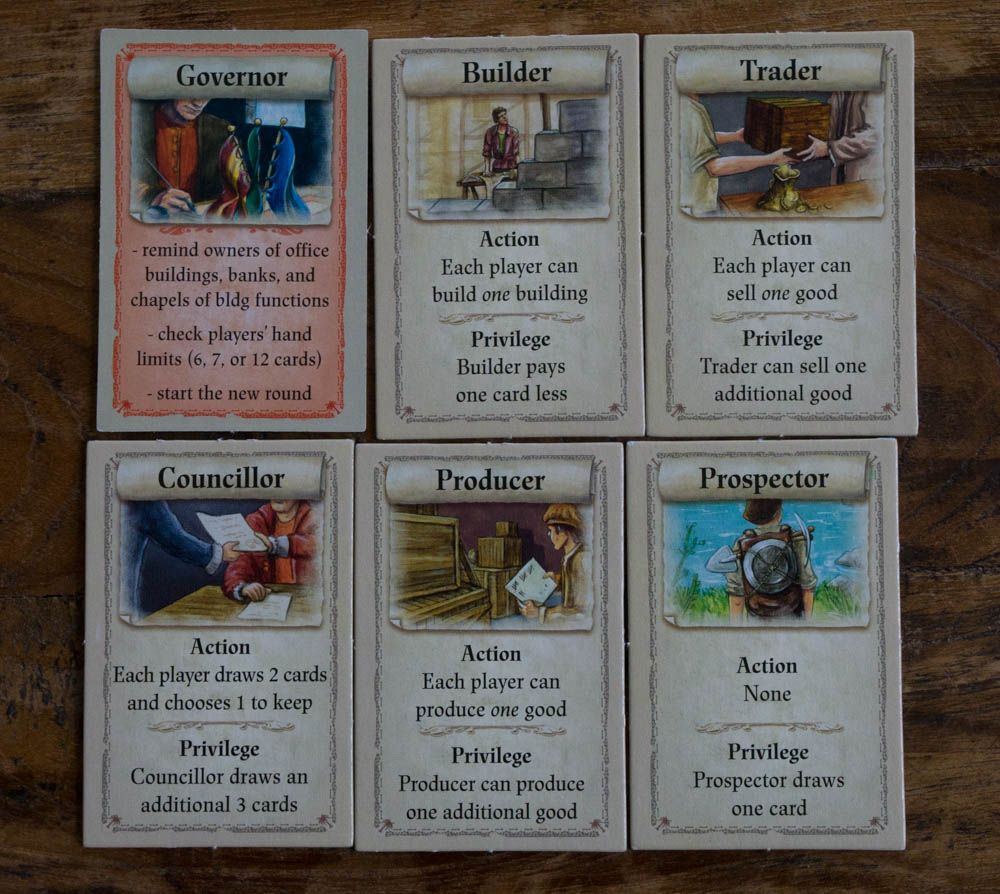 In Race everyone gets their own set of role selection cards. We all simultaneously pick which role we want, allowing more than one player to be the selector for a role in a round. Only the roles that are selected by someone will play in the round and there is a fixed sequence that the roles are played in during the round, as opposed to San Juan / Puerto Rico where the order of the roles in the round comes from the order in which players select. For me, both styles work equally well.