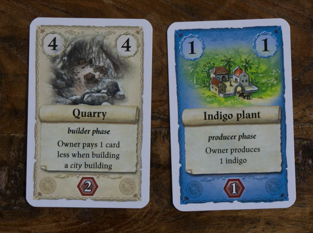 Different production buildings lead to different amounts of cards I sell for: sugar will give 2 cards but coffee gives me 4. As you might expect it costs less to build a sugar mill than a coffee roaster, so I may have to decide between a cheap production building I can build now, or a more expensive one later. Or perhaps my choice is between losing all my cards for a better production building, or building something cheaper and still keep a valuable card in my hand for a later build. Timing between production and trading is important, as each production building can only hold one good. So if I have an empty production building, but my opponents' buildings are all full, then it's a good time to produce. Similarly its good to trade if I have goods but others don't.