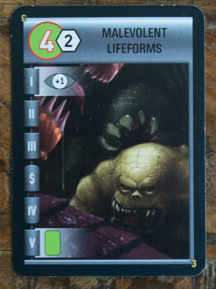 You need to learn Race's icons to understand what this card does, but once you do it's easy to see and scan. Down the left are the phases of each turn, so I can quickly see that this card has powers in phases I and V. In phase one I get to see one extra card, in phase five I produce one green good.
