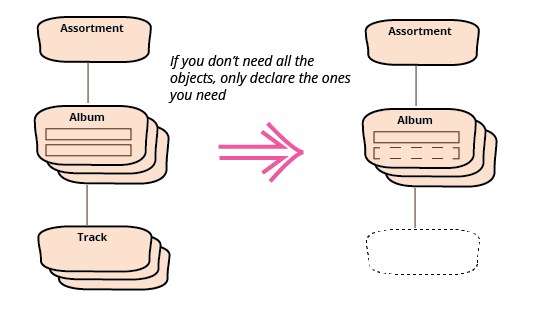 For my example, let's imagine a client that wants a list of tracks. Since there's only an album class in between the track and the assortment, I would handle that case by databinding. But let's pretend there are a dozen unneeded layers in the way, what then?