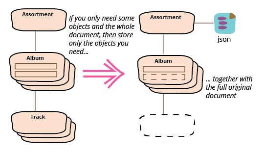 What if we have a large document that would need many classes to represent, most of which are unnecessary, but has some important stuff down towards the leaves of the tree? With the earlier example about lists of album titles, I could support them and shave off the tracks by databinding to a subset of the JSON data. But what if I only wanted something lower down?