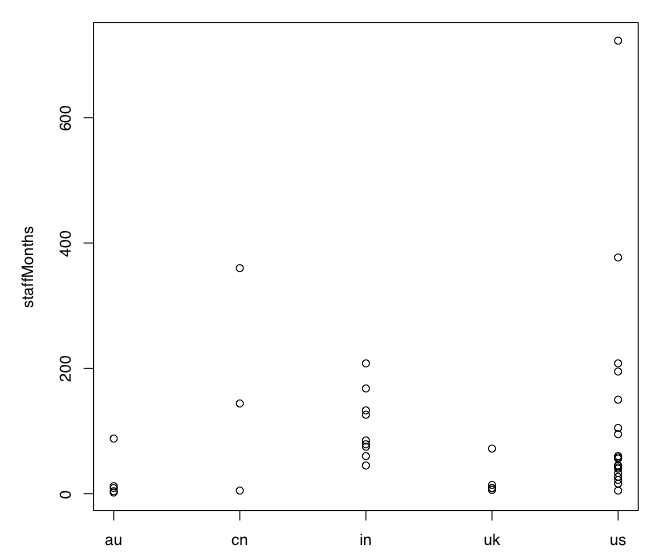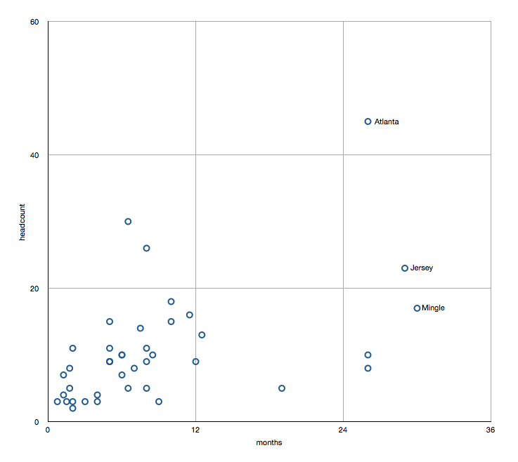 Figure 1: Scatterplot of peak headcount versus involved length for Thoughtworks Ruby projects in 2006-8.