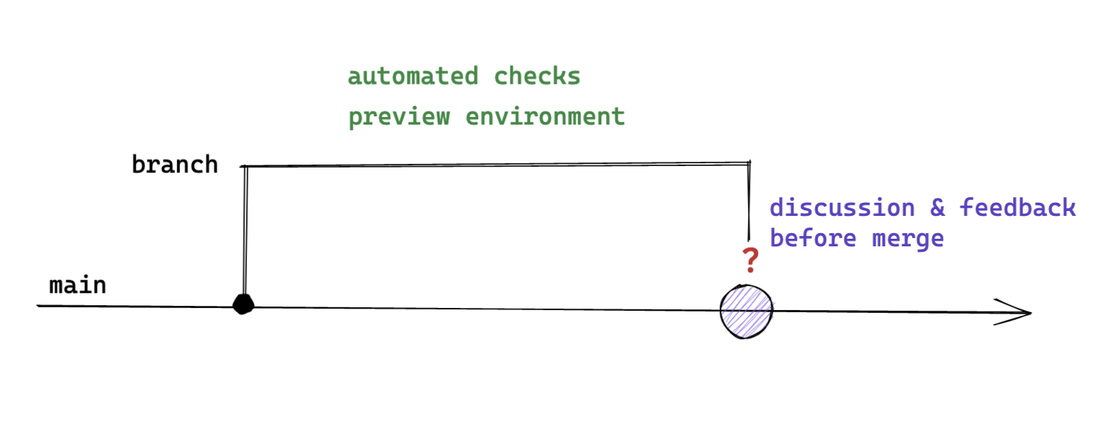 Here we pause. We make our changes on a branch, we open a Pull Request, and we wait for feedback before merging. Maybe we’re not sure we’ve taken the right approach. Maybe there’s some code we’re not quite happy with but we’re unsure how to improve it. Maybe you’ve done an experiment and want to see what people think.