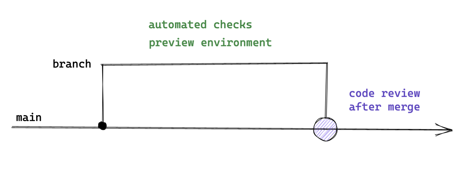 This is where we take the Continuous Integration mindset and still make use of all the goodness Pull Requests can give us. You make your change on a branch, you open a Pull Request, then you merge it without waiting for anyone. You’ll want to wait for your automated checks (tests, code coverage, preview environments, etc.), but you don’t wait for anyone’s feedback to proceed with taking your change live.