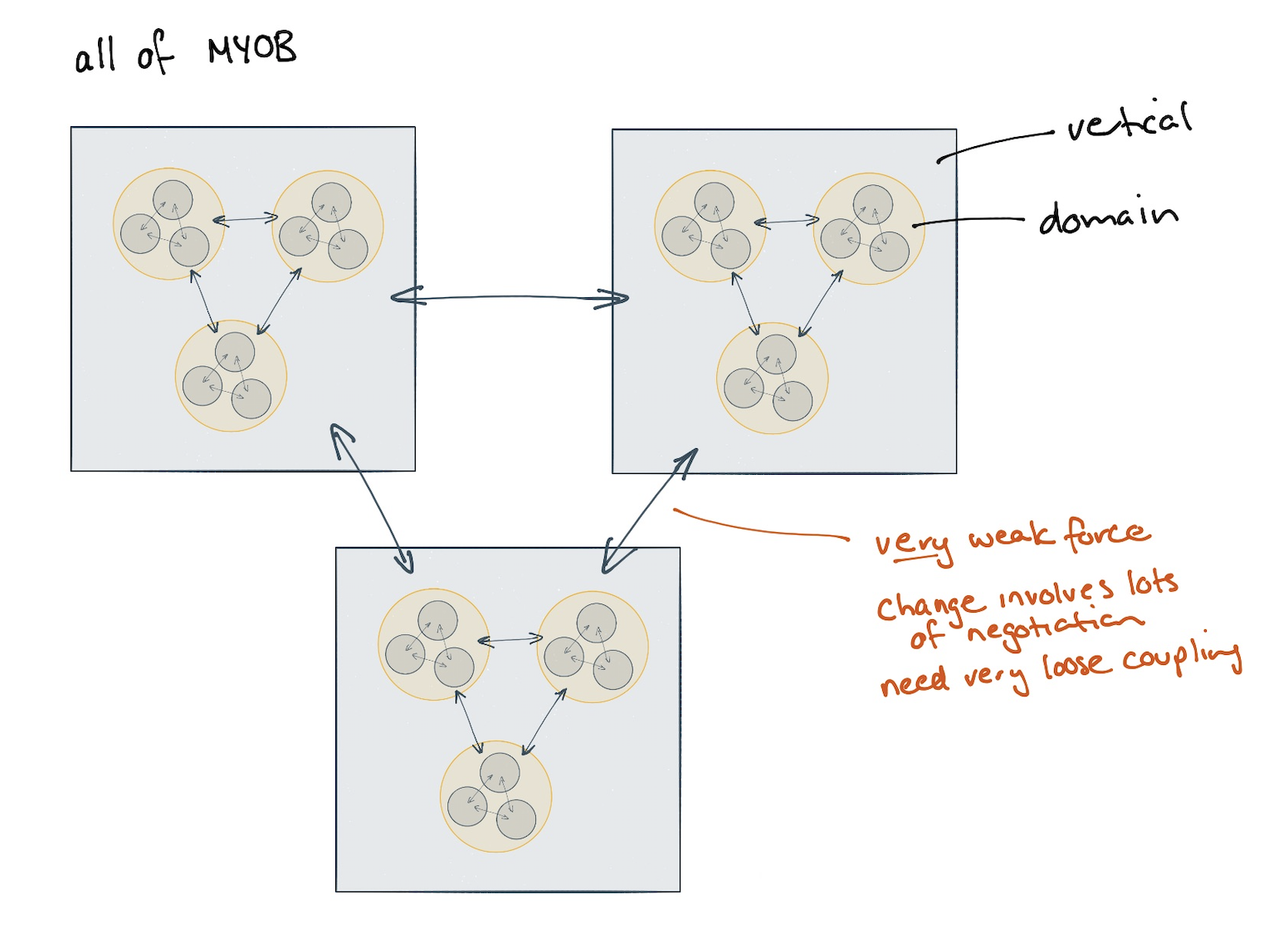 When we zoom out to all of the organisation - the force of alignment between the verticals is very weak indeed. It is quite hard to make changes atomically across the landscape - mostly because the prioritisation of work for each vertical is deliberately independent. Co-ordinating work at this level is necessarily much slower and limiting. This means our design decisions and approaches need to adapt accordingly.