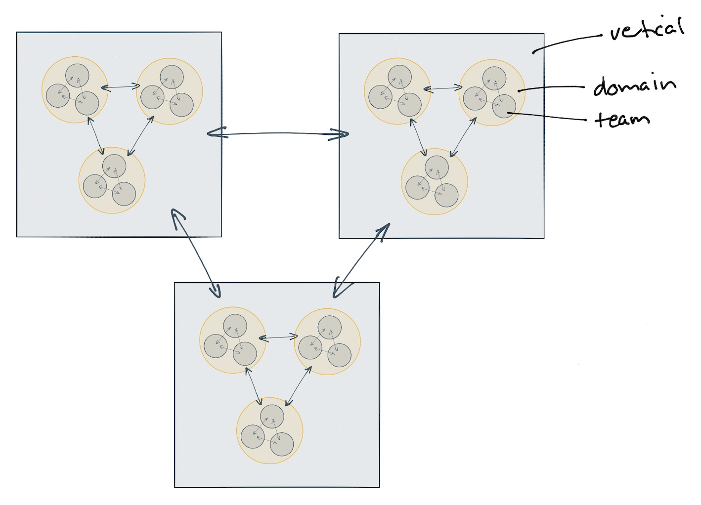 Within a single domain, even across 3-5 teams, we should have high bandwidth communication and a short distance to empowered leadership.