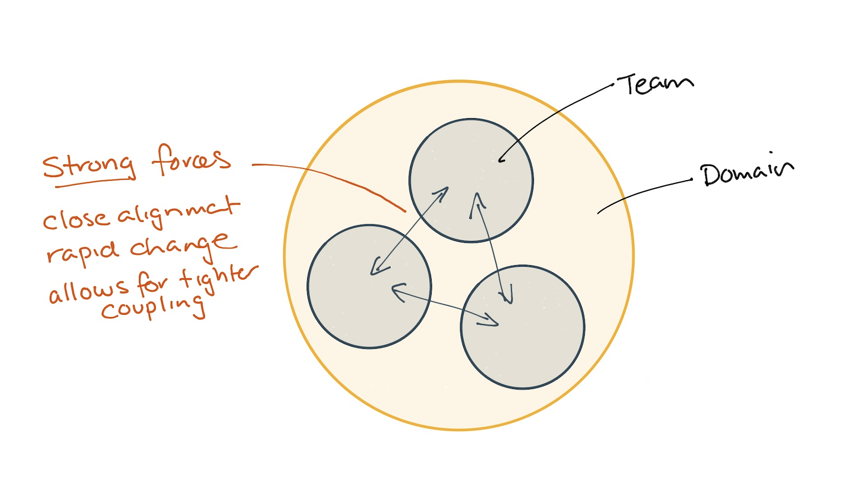Within a domain we have multiple teams, each being responsible for some capabilities and underlying systems within the domain. Sometimes this is perfectly aligned, with each team being custodians of a neatly bounded set of systems. More often this is imperfect in reality, with custodianship of some systems being shared across teams - often for legacy reasons. For teams within a domain, there is a very strong force of alignment.