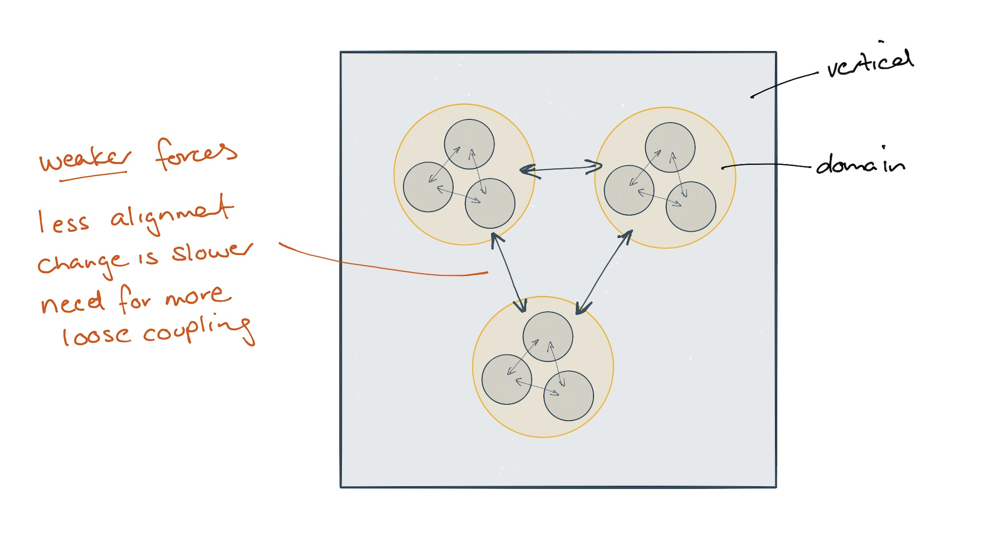 In the middle ground we have our vertical structure, with multiple domains. The social distance between the people in one domain and another is getting stretched. This makes negotiation and reaching alignment more strained and slower, and so necessarily this impacts our technology choices and approaches.