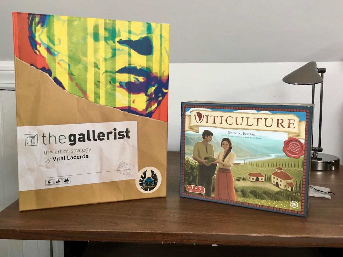 In latter half of last year, I bought two board games: Viticulture and The Gallerist. I've enjoyed them both, and have been struck by their similarities. Enough to inspire me to write this note comparing the two of them. I've played each one about a dozen times. I play most often with just my wife, but have played each game a couple of times with a larger player count too.