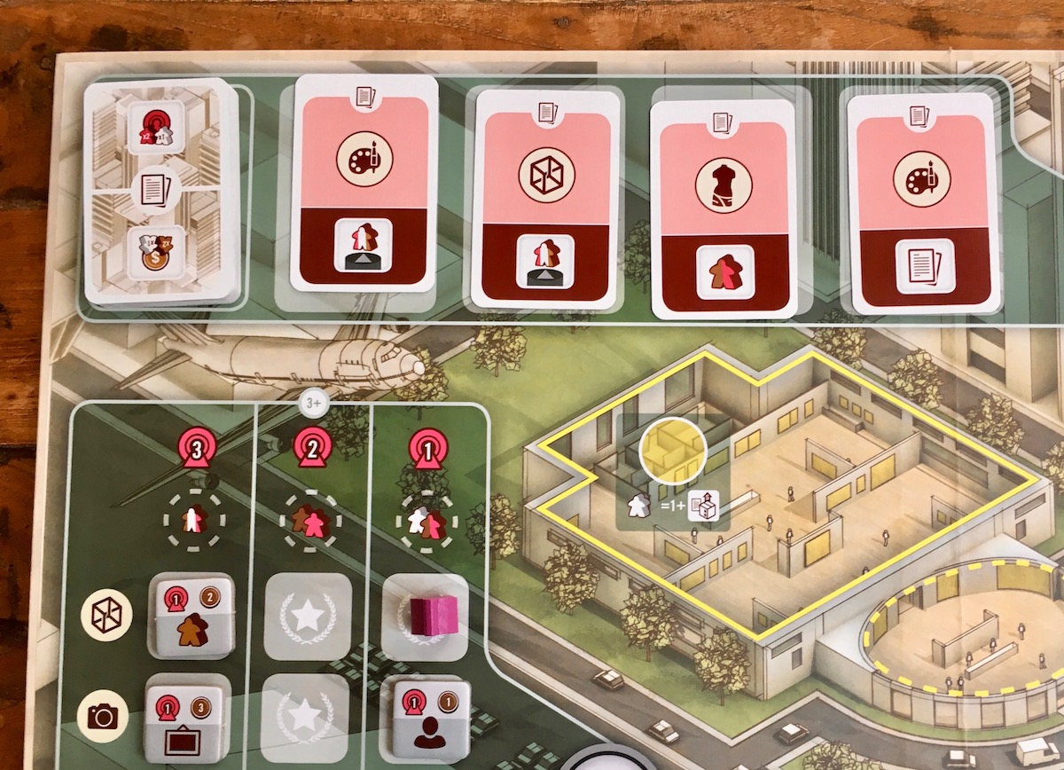 The Gallerist also has a shared game board that all the players use to select actions by placing workers - however the mechanism works quite differently. Each player only has one worker. If another player's worker is on the place I want to go to, I'm not blocked, but if I do take it that player gets a bonus action. My decision is whether I'd rather take the action and give the bonus, or pick an open place.