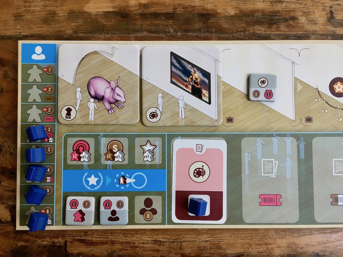 The Gallerist is heavy for other reasons too. In Viticulture you choose your action and resolve it quickly, but many actions in The Gallerist are multi-step affairs. Buying art isn't just handing over some money and getting art, instead you hand over the money, move some visitors to the plaza, take some tickets, increase the fame of the artist, put your new art in your gallery, and put new visitors on top of the art pile. Each step is clearly stated on the (excellent) player card, but I do find I have to make myself explicitly follow the steps on the card, or I'm likely to miss out an important part of the clockwork. After a couple of successive games, maybe I can trust myself to carry out an action without checking the card, but if I haven't played for a few weeks, I certainly need to use it again. Writing it out like this probably makes it sound worse that it is in the game, but it does make for less smoothness in the game play.