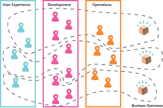 Traditionally, big businesses with large IT departments (Enterprise IT) have tended to execute IT development projects with a bunch of activity-oriented teams drawn from a matrix IT organization (functional organization). The solid-lined arms of the matrix (headed by a VP of development, testing and so on) are usually along activity boundaries and they loan out “resources” to dotted-lined project or program organizations. Common justifications for doing so include: