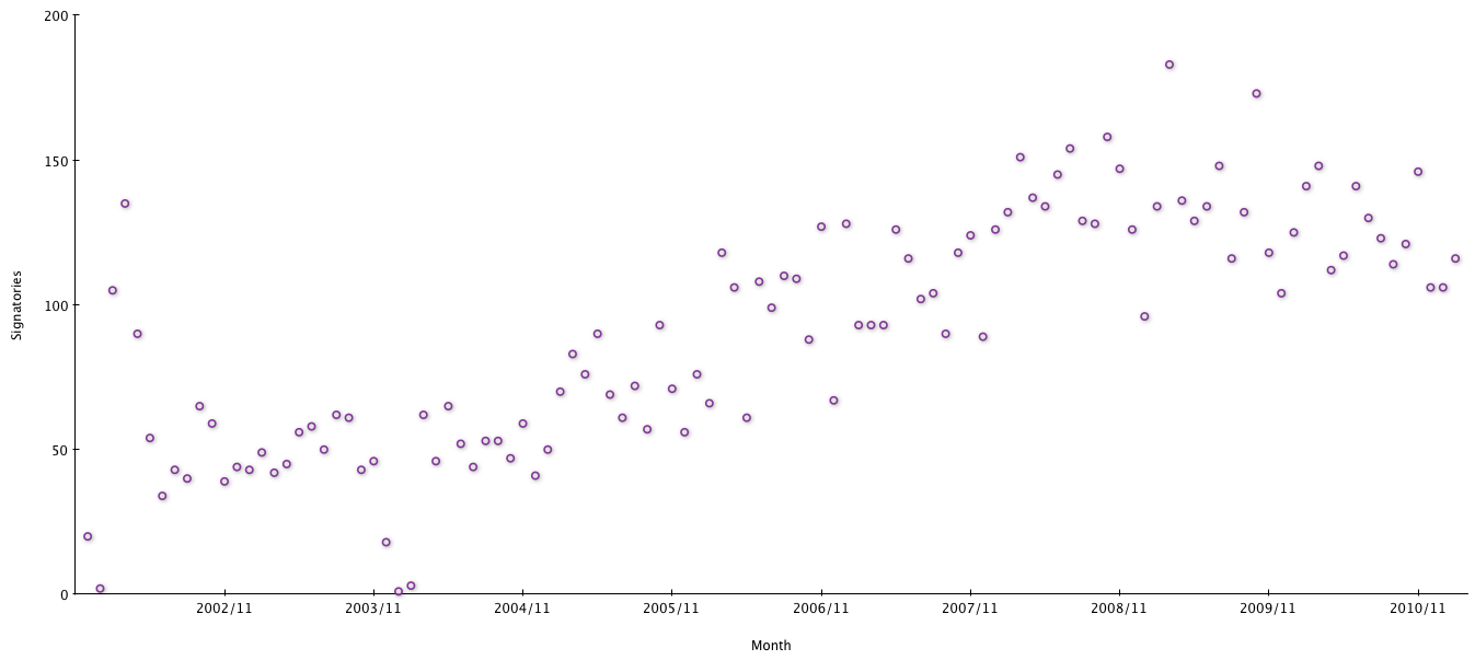 In a recent fit of curiosity I asked Ward for some data on the signatories. He did a bit of munging through his logs and I did some more munging on the data he gave me. Here's a plot of the number of signatories per month since the manifesto became signable
