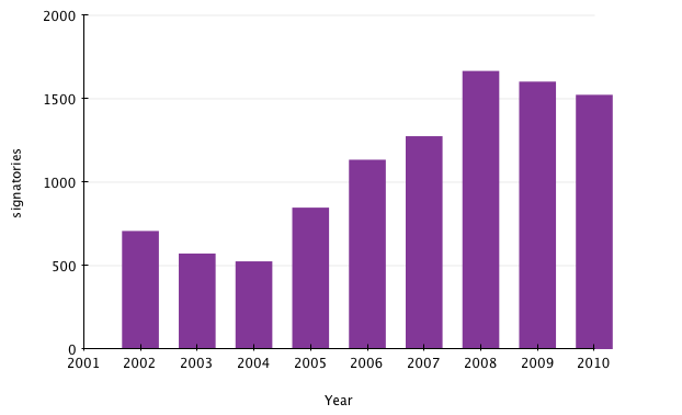 As you can see, the manifesto had a definite increase in monthly signers from 2004 to 2008. I think you get a better sense of this by looking at the number of signatories per year.