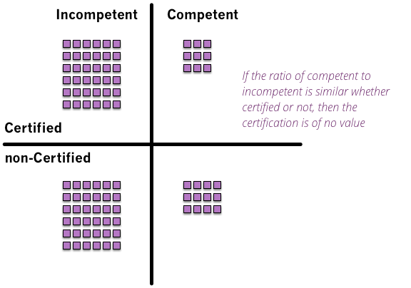 Most of my friends and colleagues are very negative about certification schemes in software development, a disdain that I share. This doesn't mean that I think that certifications in software are bad by definition, just that almost every one we see fails a basic test.