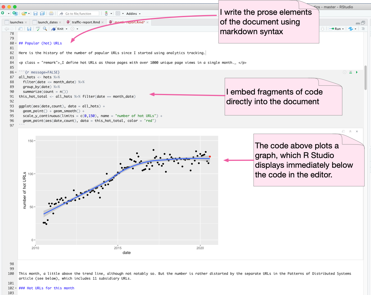 Here's an example of this, looking at some analysis of my google analytics data for martinfowler.com. I'm doing this in R Studio, which uses the R Markdown format.