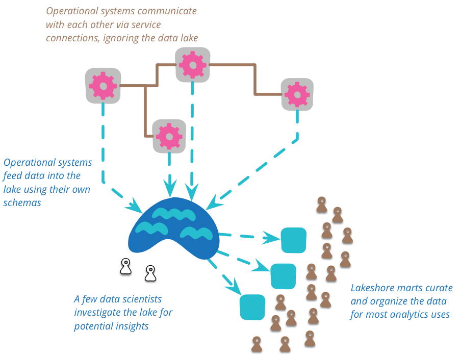 The complexity of this raw data means that there is room for something that curates the data into a more manageable structure (as well as reducing the considerable volume of data.) The data lake shouldn't be accessed directly very much. Because the data is raw, you need a lot of skill to make any sense of it. You have relatively few people who work in the data lake, as they uncover generally useful views of data in the lake, they can create a number of data marts each of which has a specific model for a single bounded context. A larger number of downstream users can then treat these lakeshore marts as an authoritative source for that context.