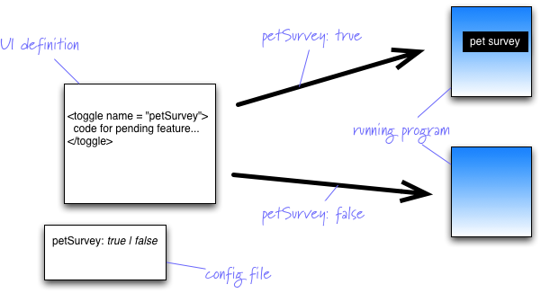 Most of these decisions occur in the user-interface of the application. So if you are building a web application using jsp, you may use a set of jsp tags to surround any user-interface parts of a pending feature.