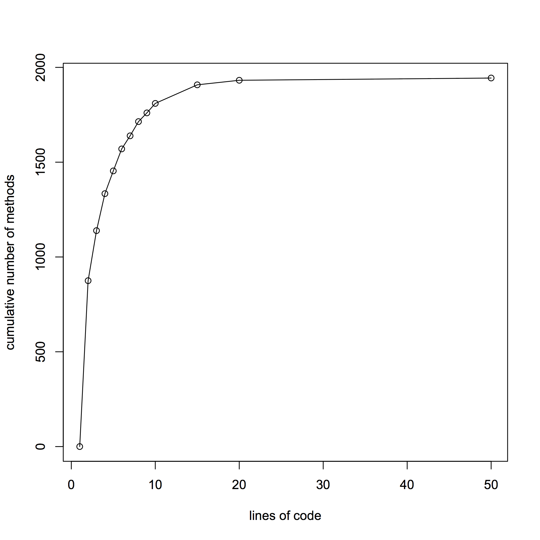 Recently I got curious about function length in the toolchain that builds this website. It's mostly Ruby and runs to about 15 KLOC. Here's a cumulative frequency plot for the method body lengths