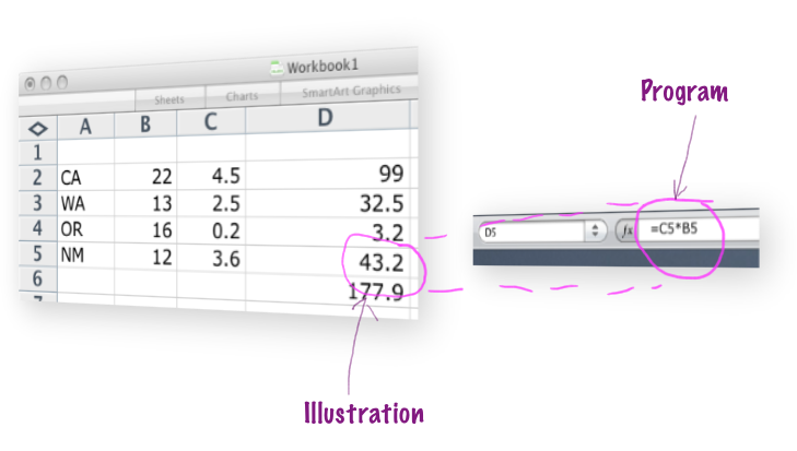 One property of spreadsheets, that I think is important, is its ability to fuse the execution of the program together with its definition. When you look at a spreadsheet, the formulae of the spreadsheet are not immediately apparent, instead what you see is the calculated numbers - an illustration of what the program does.