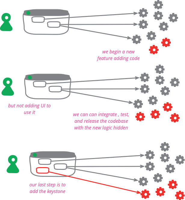 That said, there are cases when the UI can't be packaged into a simple keystone. When that's the case then it's time to use Feature Flags. Even in this case, however, thinking of a keystone can be useful by ensuring that the feature toggle only applies to the UI. This avoids scattering lots of toggle points through the back end code, reduces the complexity of applying the toggle, allows the use of simple toggle mechanisms, and makes it easier to remove when the time comes.