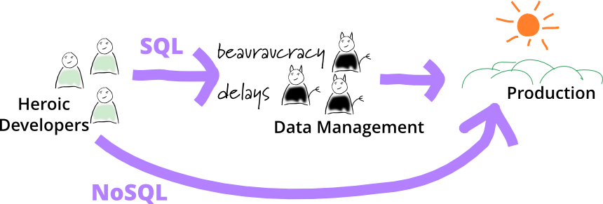 So application development groups tell me of using NoSQL databases to do an end-run around the DBAs. It helps that they are using a “mere datastore” here, not a “proper database”. That way the DBAs can be kept out of the loop, often not told or happy to not care. 1