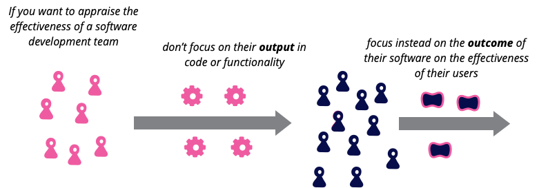 Imagine a team writing software for a shopping website. If we look at the team's output, we might consider how many new features they produced in the last quarter, or a cross-functional measure such as a reduction in page load time. An outcome measure, however, would consider measure increased sales revenue, or reduced number of support calls for the product. Focusing on outcomes, rather than output, favors building features that do more to improve the effectiveness of the software's users and customers.