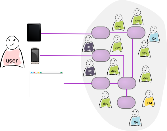 This is why I consider the desire to create a mobile application to be a Wrong Thought. It immediately frames the mobile application as something separate from the web site, as is the thinking that you're building just a web site. Instead you need to start with the user, figuring out what it is that they want to do and how software can help them do that. When thinking about this everyone needs to be thinking in a transmedia manner - and by everyone I mean all parts of the work: user experience, software architecture, project management…. The application, and the project team that builds it, need to be thought of as a single whole, all dedicated to making their users happy.