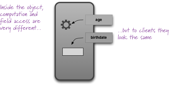The essential point of the principle is that if you have a person object and you ask it for its age, you should use the same notation whether the age is a stored field of the object or a computed value. It effectively means that a client of the person should neither know nor care whether the age is stored or computed.
