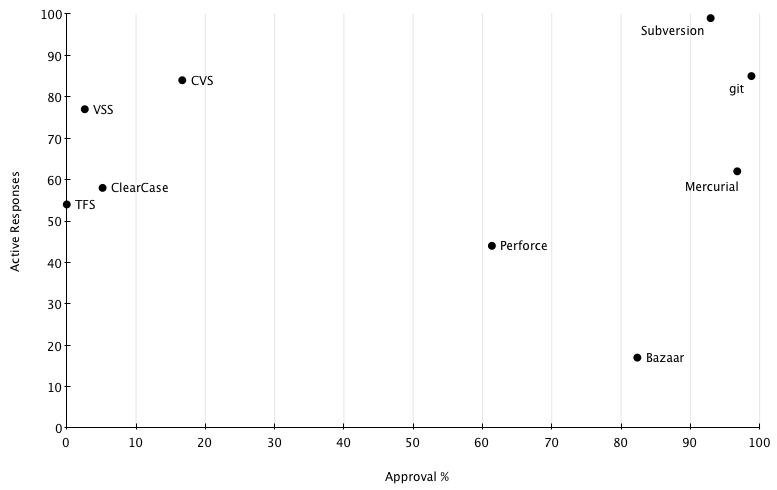 The graph shows a scatter plot of approval percentage and active responses. As you can see there's a clear cluster around Subversion, git, and Mercurial with high approval and a large amount of responses. It's also clear that there's a big divide in approval between those three, together with Bazaar and Perforce, versus the rest.