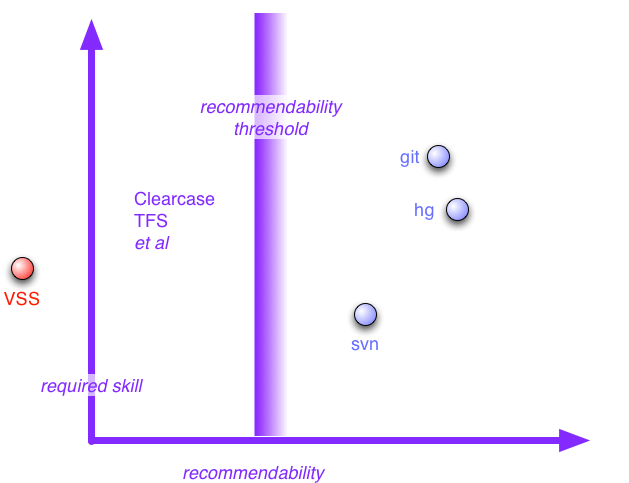 The second reason for shuffling a tool behind the recommendability threshold is that I don't hear many comments about some tools. This is an issue because less-popular tools make it difficult to find developers who know how to use them or want to find out. There are many reasons why otherwise good tools can fall behind there. I used to hear people say good things about Perforce, but now the feeling seems to be that it doesn't have compelling advantages over Subversion, let alone the DVCSs. Speaking of DVCSs, there are more than just the two I've highlighted here. Bazaar, in particular, is one I occasionally hear good things about, but again I hear about it much less often then git or Mercurial.