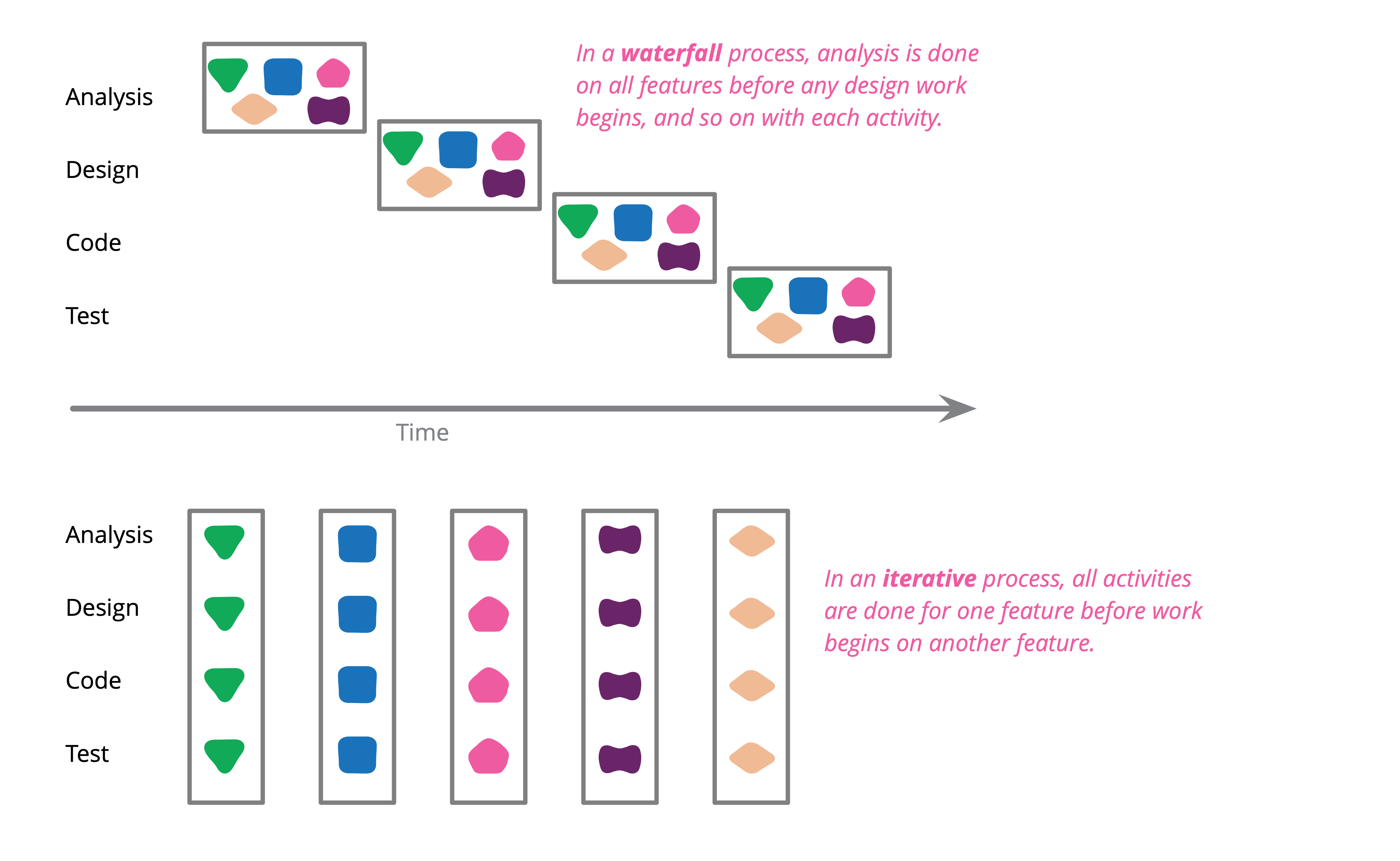 In this thinking waterfall means “do one activity at a time for all the features” while iterative means “do all activities for one feature at a time”.