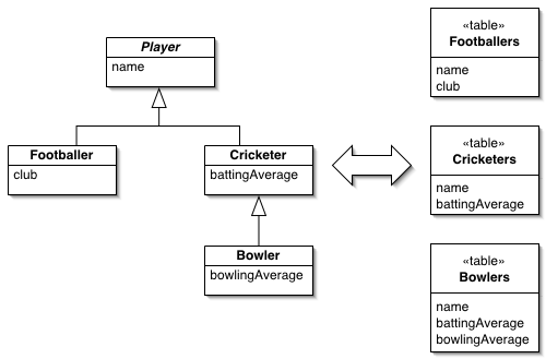 I'll confess to having had some difficulty naming this pattern. Most people think of it as leaf oriented since you usually have one table per leaf class in a hierarchy. Following that logic, I could call this pattern leaf table inheritance, and the term “leaf” is often used for this pattern. Strictly, however, a concrete class that isn't a leaf usually gets a table as well, so I decided to go with the more correct, if less intuitive term.