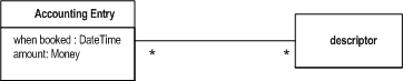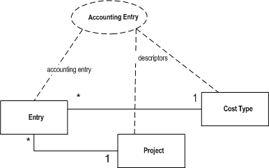In a particular model, you will usually model the descriptors as separate classes with separate relationships to the entry. So if we are doing job costing, we might want to mark each entry with a project and a cost type. The project and cost type are the descriptors for the entry. In our model we would show these as separate relationships as in Figure 1.