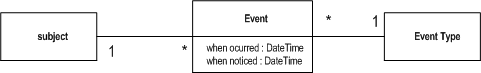 Events are about something happening at a point in time, so it's natural for events to contain time information. When doing this it's important to consider two Time Point that could be stored with the event: the time the event occurred in the world and the time the event was noticed . These Time Points correspond to the notions of actual and record time.