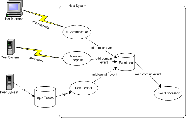 Figure 1 helps illustrate the point. Here we have a system with inputs from a user interface, messaging system, and some direct manipulation of database tables. In order to resolve these to Domain Event we have components that interact with each of these input streams and convert the inputs into a stream of Domain Event which are stored in a persistent log. An event processor then reads the events from the log and processes them triggering our application to do whatever it's supposed to do.