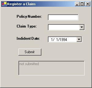 In Figure 1 I have a simplistic form to submit to judge an insurance claim. I have three bits of data to submit: the policy number (a string), the type of claim (text from a pick list), and the date of the incident (a DateTime).