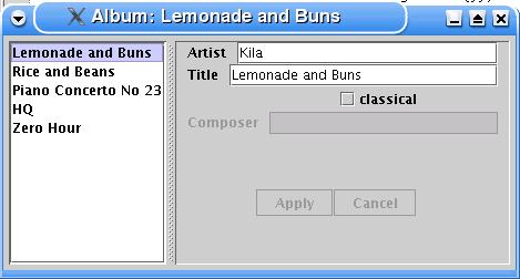 For much of the discussion and examples here, I'm going to use a single example screen to discuss the issues that come up ( Figure 1). The window shows information about music recordings. For each album it displays the artist, title, whether it's a classical recording, and if it is classical: the composer. I chose the example to include some elements of presentation logic.