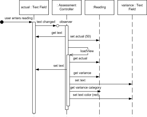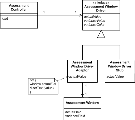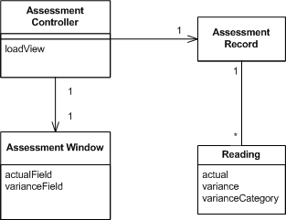 Looking at our regular assessment window example, again we see a view/controller split, but this time the controller does all the work in figuring out how the view should display the model. The text field widget receives the user gesture but immediately hands off to the controller, in the classic MVP movement. The controller then updates the model, and then handles the reloading of the view from the model. This load actions involves pulling all the data needed from the model, and using it to update the widgets. This example shows a coarse-grained synchronization, where any change results in a complete reload.