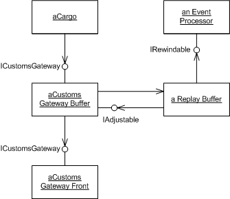 Because much of the retroactive rewinding is generic, I can put the generic behavior into a different class, ReplayBuffer, so that the Customs Gateway Buffer only handles stuff that's particular to the customs case. The replay buffer does need some communication with the event processor to deal with various stages in the rewind/replay process. It also needs some way to adjust the mismatching events in the end, a task that in this case I assign to the customs gateway buffer. In both of these cases the rewind buffer communicates through collaboration interfaces in order to keep its generic purity.