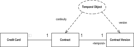 Another aspect of this to bear in mind is that often the continuity is not represented by an object, particularly in less OO style systems. For example, in a relational database you may well only have the a table for the versions, and no table for the continuity. In such a relational model, the continuity is implemented by a field such as the contract number. The primary key of the contracts table would combine this contract number and part of the Effectivity, such as the start date.