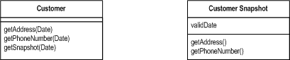 Temporal Property introduces the notion of referring to things with a time-based index, but takes it only so far as a single property. If you have many temporal properties on an object, things can become clumsy. There are two ways of dealing with this. The first is to use Snapshot, which gives you an object that refers to the state of the real object as at a point in time. Thus if you want to ask a lot of questions of a customer as at April 1st 2000 you ask for a Snapshot of that customer for April 1st 2000 and then ask for values of properties without having to keep repeating the date.