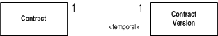 Snapshot allows you to have a view of an object at a date, but sometimes you really want to think of an object going through explicit versions as changes are made through time. This desire leads to Temporal Object. Temporal Object comes in many forms, but the most straightforward form has two classes as in Figure 4. The contract class is the one that is usually referred to by other objects as it represents the contract through time. It contains a collection of versions which record the state of the contract at each change. This allows people to refer to either the unchanging notion of a contact, or a specific version at a particular point in time.
